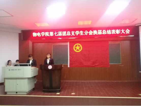大会共分为十二项议程,在嘹亮的国歌声中,总结表彰大会正式开始。首先由张恒道老师致辞。议程第三项是团学各部门进行了任期内的工作汇报,各部门用一张张照片,一份份表格,一个个数据清楚的展示自己在一年里所做的工作。议程第四项是第七届团学分会主席林琪琅和学生副书记刘妍做团学工作总结报告。议程第五项团总支书记张恒道老师宣读了表彰文件并对优秀干部干事进行了颁奖。议程第七项宣布第八届团学委员名单。议程第八项第八届学生会主席李泽鹏,学生副书记黄欢进行了就职发言,议程第九项两届主席团交接院旗。议程第十项第八届团学委员会委员进行了集体入职宣誓。