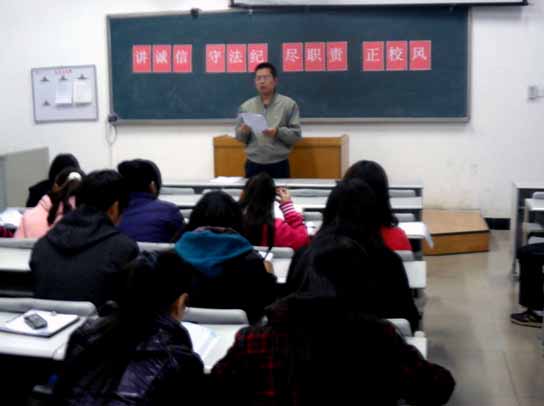 张文科老师首先传达了学校“讲诚信、守法纪、尽职责、正校风”主题教育活动的有关精神,并结合物电学院实际,就物电学院如何开展好此次为期2个月的教育活动进行了具体部署和安排。他强调:一要深入学习贯彻党的十七届六中全会精神,在学生中掀起“讲诚信、守法纪、尽职责”的热潮;二要充分认识到少数大学生中间不讲诚信、道德缺失现象的严重危害,要求同学们辨明是非,从小事做起,从自己做起;三要按照物电学院制订的活动方案,认真扎实的开展活动,确保此次“讲诚信、守法纪、尽职责、正校风”活动取得成效。四是近期各班要开展此次教育活动班会,组织学习讨论,增强同学们的遵纪守法意识,提升同学们的道德水平。通讯员:李萍