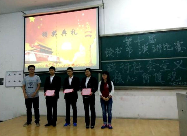 2015年5月12日晚7:00,物理与电子学院在9T2举行“读书节演讲比赛决赛”,物电学院学生会主席孙庆帅,团总支副书记周双喜,组织部部长陈煜、外联部部长赵洋出席活动并担任评委。此次演讲比赛主题是“践行社会主义核心价值观”。