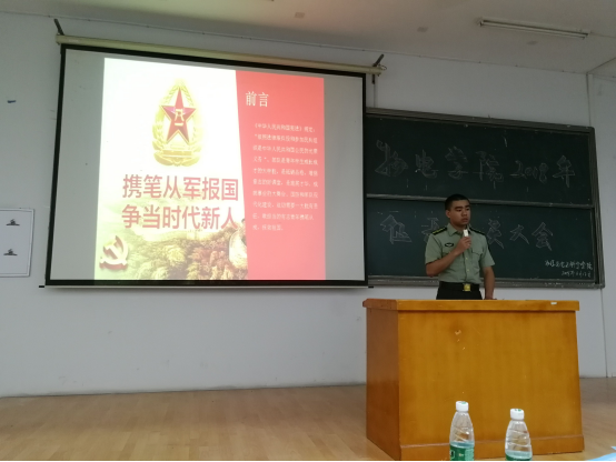 院长李宏民首先发表讲话,分析了军人对于当今国防和现代化建设的重要意义,鼓励物电学院全体青年学子响应国家号召,抓住机会,到部队成长成才将爱国之情化作报国之行。第三宣讲团南湖文法系的谢颖物电学院研究生周虎田进行政策的宣讲,介绍了征兵工作的预征对象、身体条件等对有关学费减免、复学等政策进行了解读分享了部队生活对于自己各方面的改变,成为一名军人让他们变得更坚毅勇敢,也更加有追求。