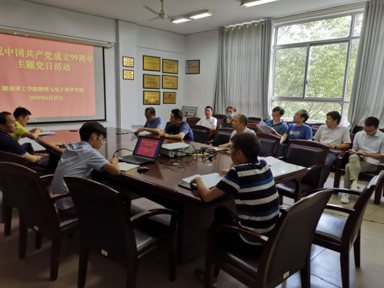 6月30日下午,物电学院在6205会议室开展建党99周年主题党日活动,活动由物电学院分党委书记罗文华主持,物电学院分党委全体领导班子及教工党员参加本次活动。