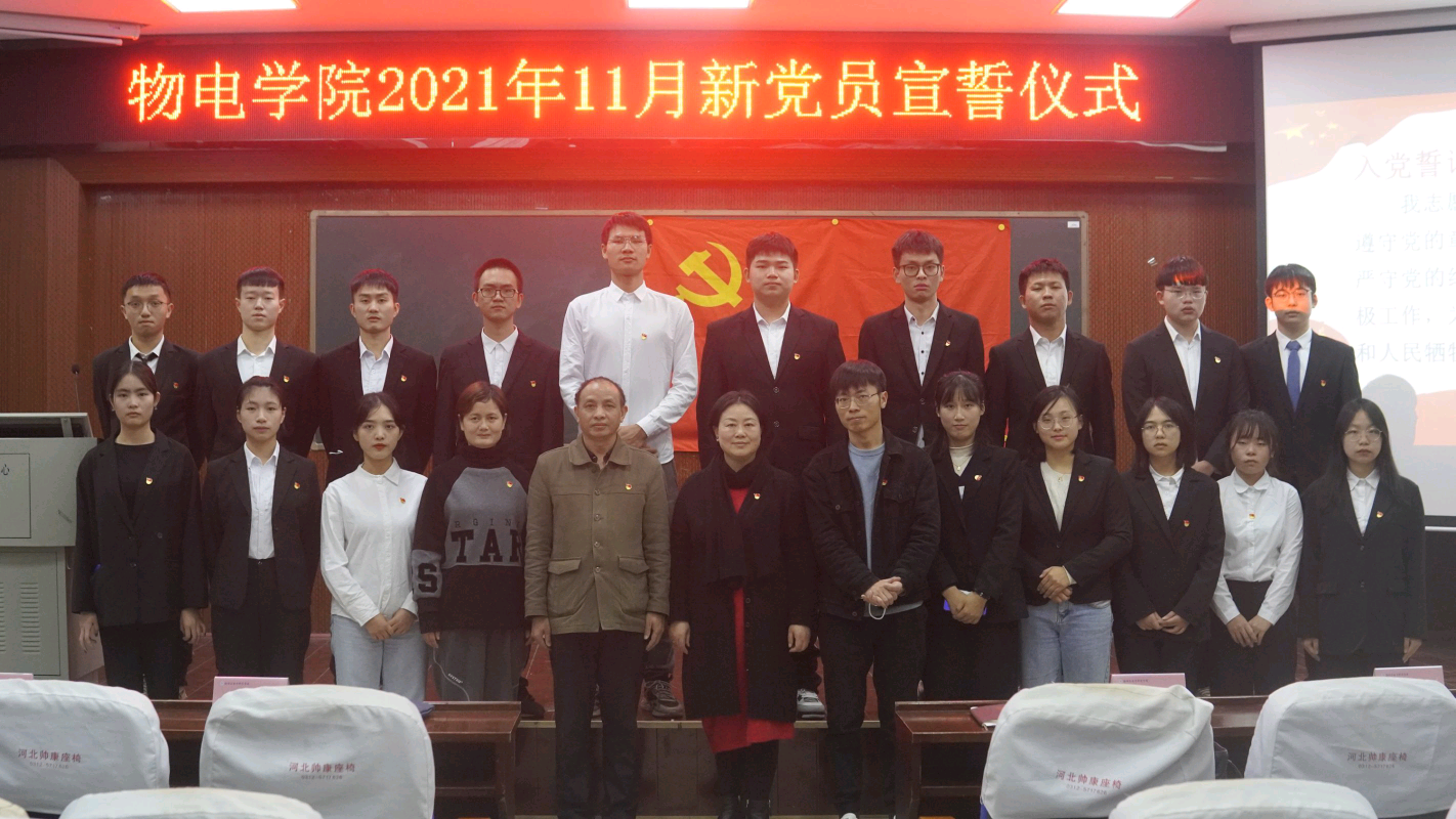 11月16日下午,物电学院新党员宣誓仪式在六栋学术报告厅举行。党委书记周畅、副书记李科敏、学生第一党支部书记何小娅、第二党支部书记严胡伟、研究生党支部书记朱虹燕出席,全体学生党员、新发展预备党员及部分入党积极分子参加。何小娅主持。