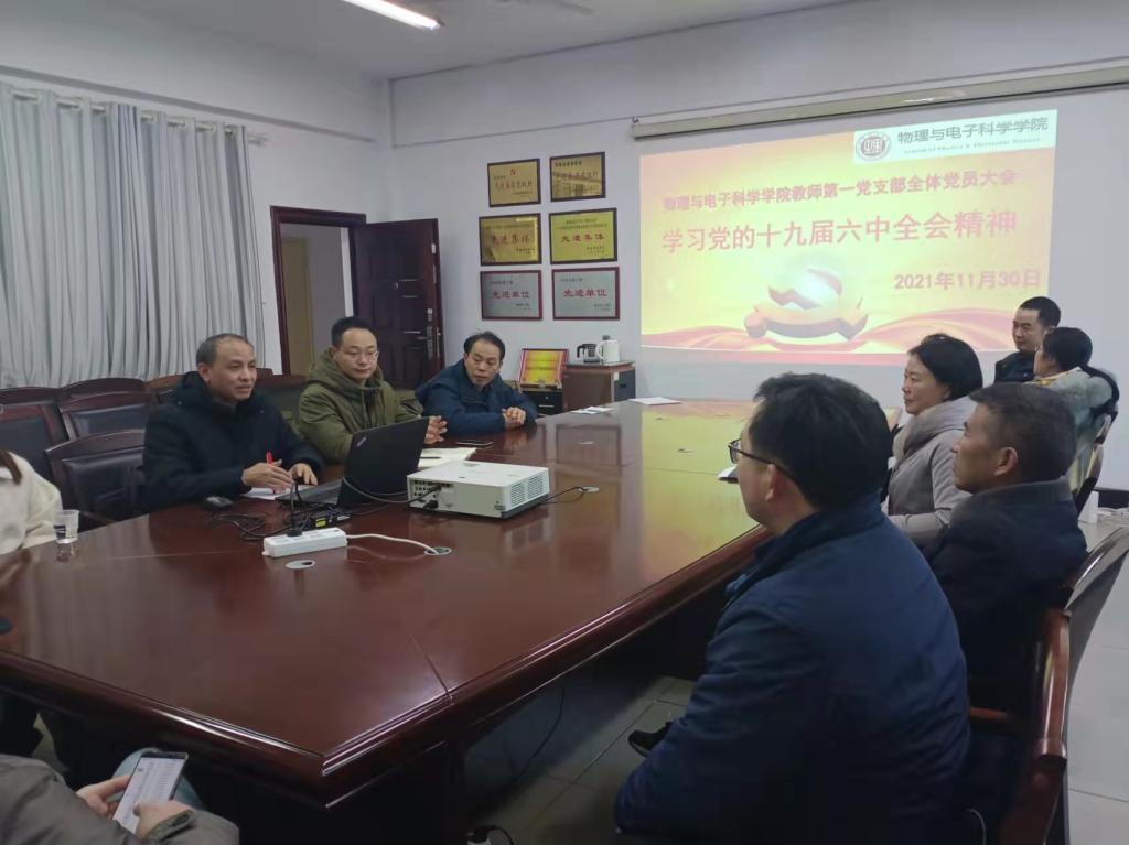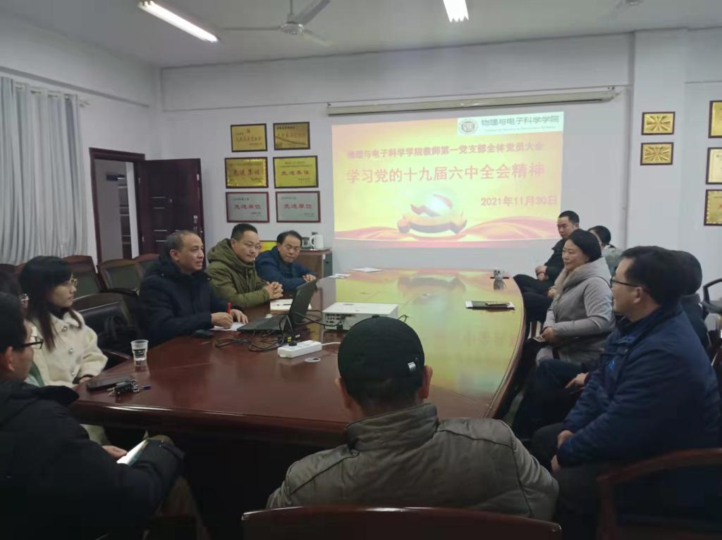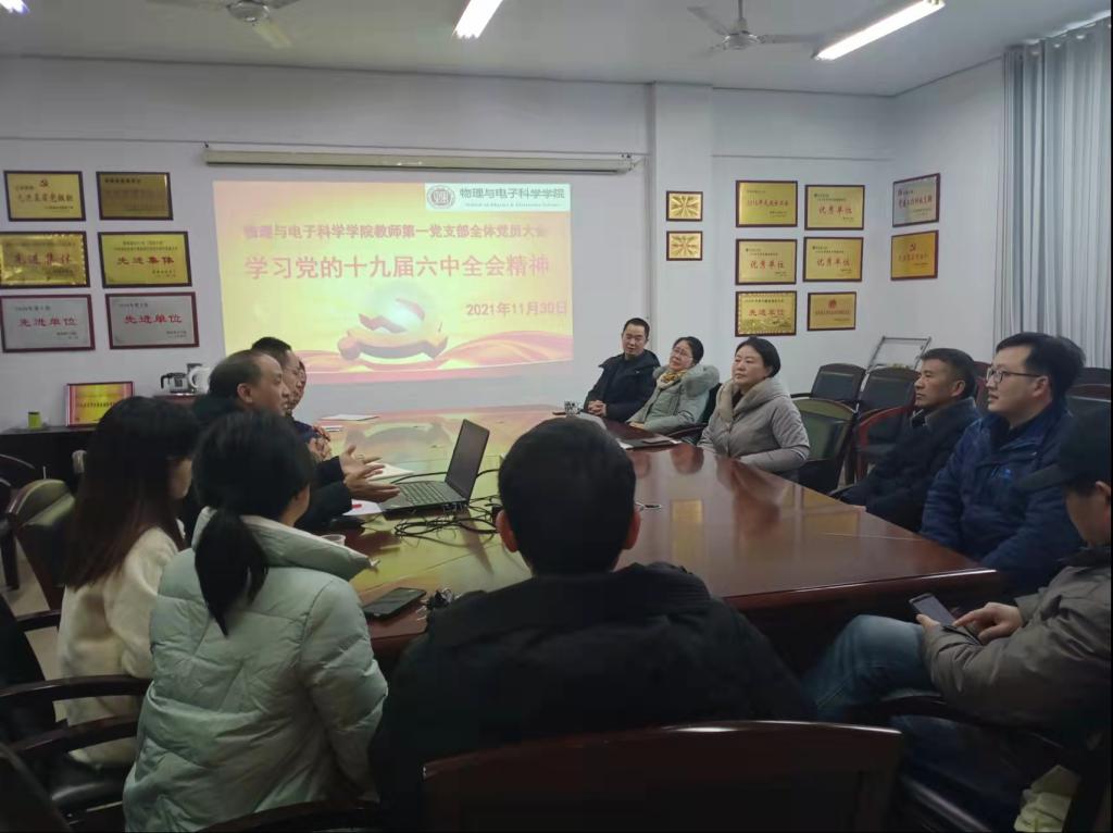 11月30日下午,物电学院教师第一党支部于6205会议室召开全体党员大会,集体学习党的十九届六中全会精神。物电学院党委书记周畅、党委副书记李科敏出席,支部全体教师党员参与学习。李科敏主讲。