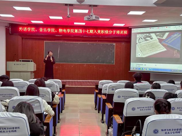 11月8日,物电、外语、音乐学院第四十七期入党积极分子培训课第二次集中党课在6栋学术报告厅开讲,物电学院党委书记周畅主讲,外语学院党委书记王敏出席并主持,三学院第四十七期入党积极分子参加。