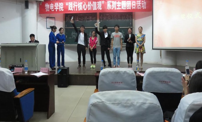 2015年5月17日晚,物理与电子学院在6号楼学术报告厅举办了“践行核心价值观,争做向上向善好青年”主题团日活动微视频大赛。校团委副书记杨姝同学和组织部部长何杰胜同学,以及物电学院学生会主席孙庆帅同学和团委副书记周双喜同学担任评委。何小娅老师出席了活动。此次活动以围绕核心价值观内容展开,以舞蹈、微电影、朗诵、拉歌等形式展现物电青年团员们身边的事迹,带动同学们以自己的实际行动践行社会主义核心价值观。