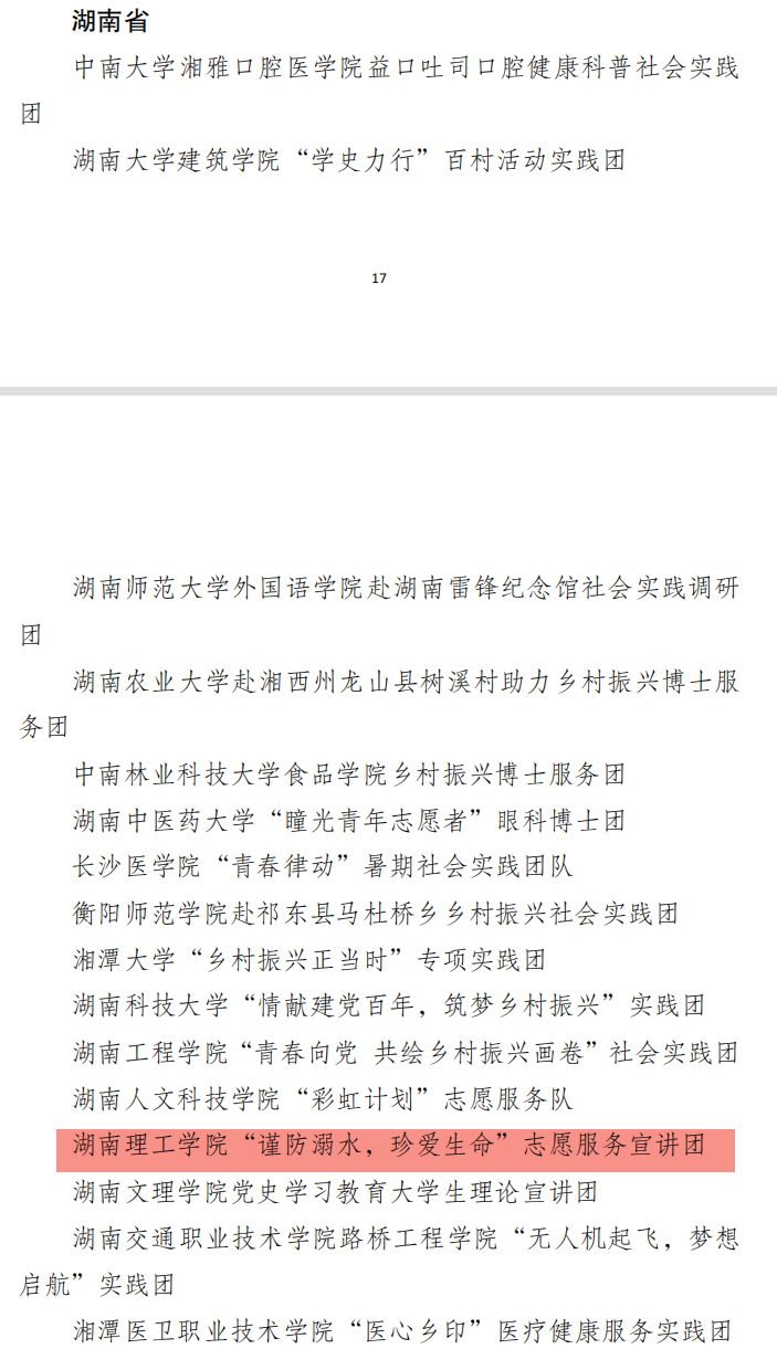 2021年12月31日,共青团中央青年发展部公布了2021年度“三下乡”社会实践优秀团队公示名单,遴选出388个“三下乡”社会实践优秀团队。我院“谨防溺水,珍爱生命”志愿宣讲团入选2021年全国大中专学生志愿者暑期“三下乡”社会实践活动优秀团队。