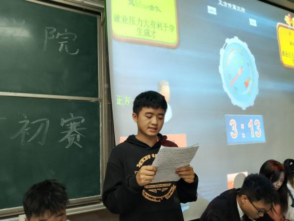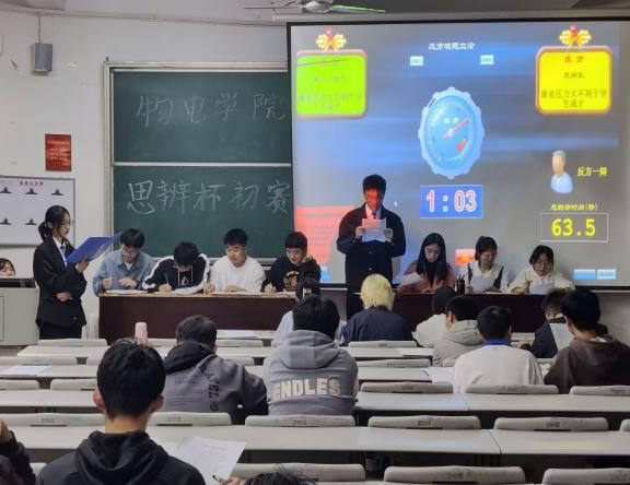 11月2日,我院为了激励同学们奋力追寻梦想,理智面对人生道路上的坎坷,物电学院在6t1和6t2教室开展“思辨杯”初赛,主持人分别是吴斯涛与唐佳宁,韩刚、杨冉、贺文洁、伍文洁等人分组担任评委,每组比赛正辩和反辩各四人,以及数余名学生前来观赛。