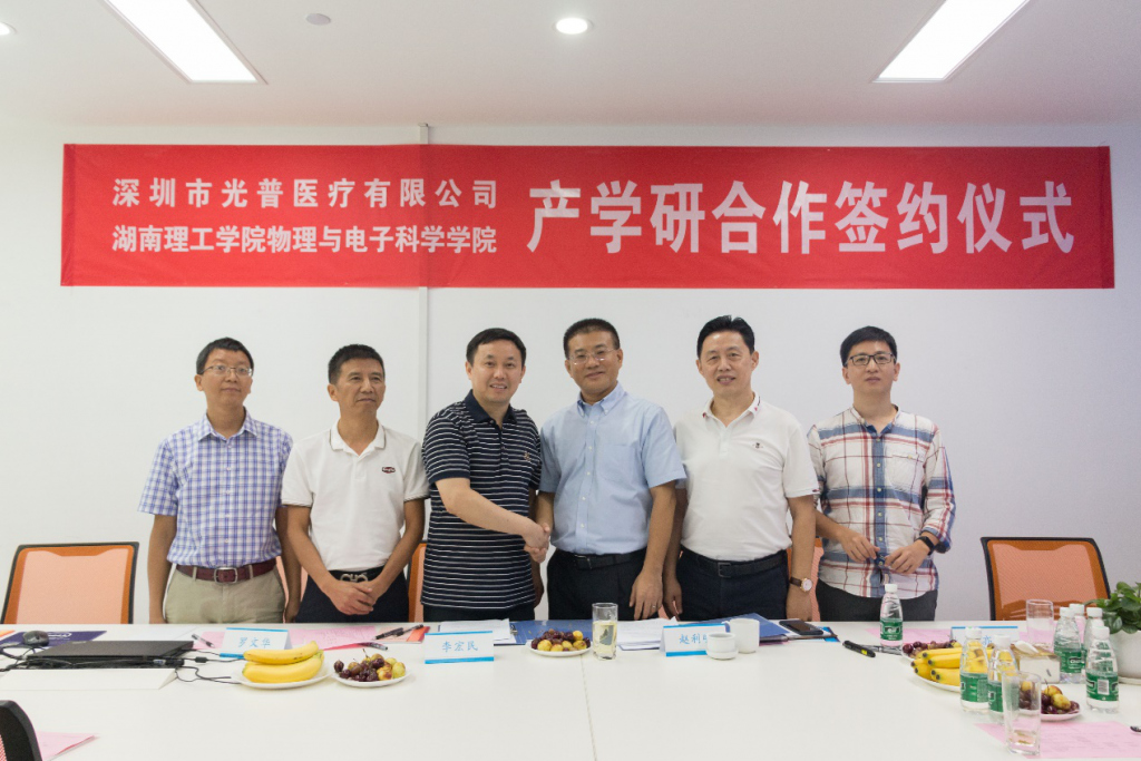 8 月 5 日,WilliamHill中文官方网站物理与电子科学学院(以下简称WilliamHill中文官方网站)李宏民院长、罗文华书记、田芃博士一行到深圳市光普医疗有限公司(以下简称光普医疗)进行实地考察。现场,双方签订了产学研合作协议,并举行了产学研基地挂牌仪式。