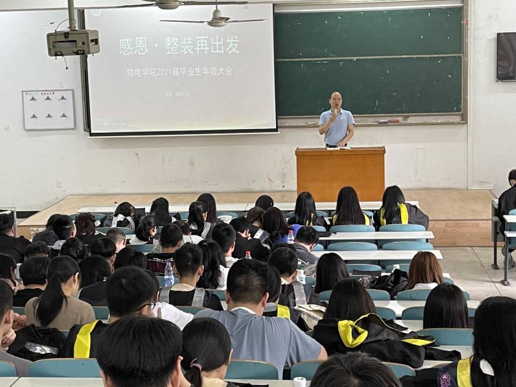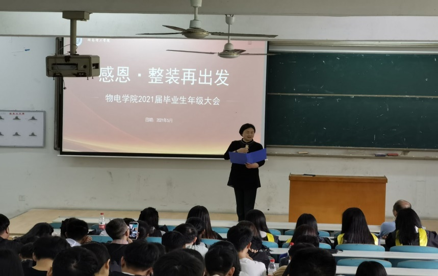 会议伊始,物电学院党委书记周畅带来了深情亲切的诗朗诵,拉近了与同学们的距离。随后周畅书记寄语同学们要先生存后发展,毕业后先要在社会上站稳脚跟再谋求发展。她强调:毕业后不一定都是人才,仍需学习并且需做好职业规划。讲话饱含对同学们亲切的关怀,让同学们对于未来毕业规划与就业有更深入的了解。随后各辅导员就毕业生档案转迁、报到证办理、就业证明材料收集、毕业离校手续办理、毕业生登记表填写、毕业体检、党团组织关系转接、应征入伍等具体事宜进行了逐一讲解,提醒同学们要严肃对待毕业离校的各项工作,同时要注意安全,确保文明、顺利、安全、有序离校。