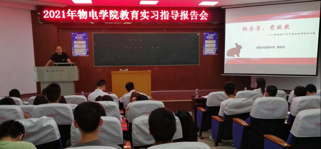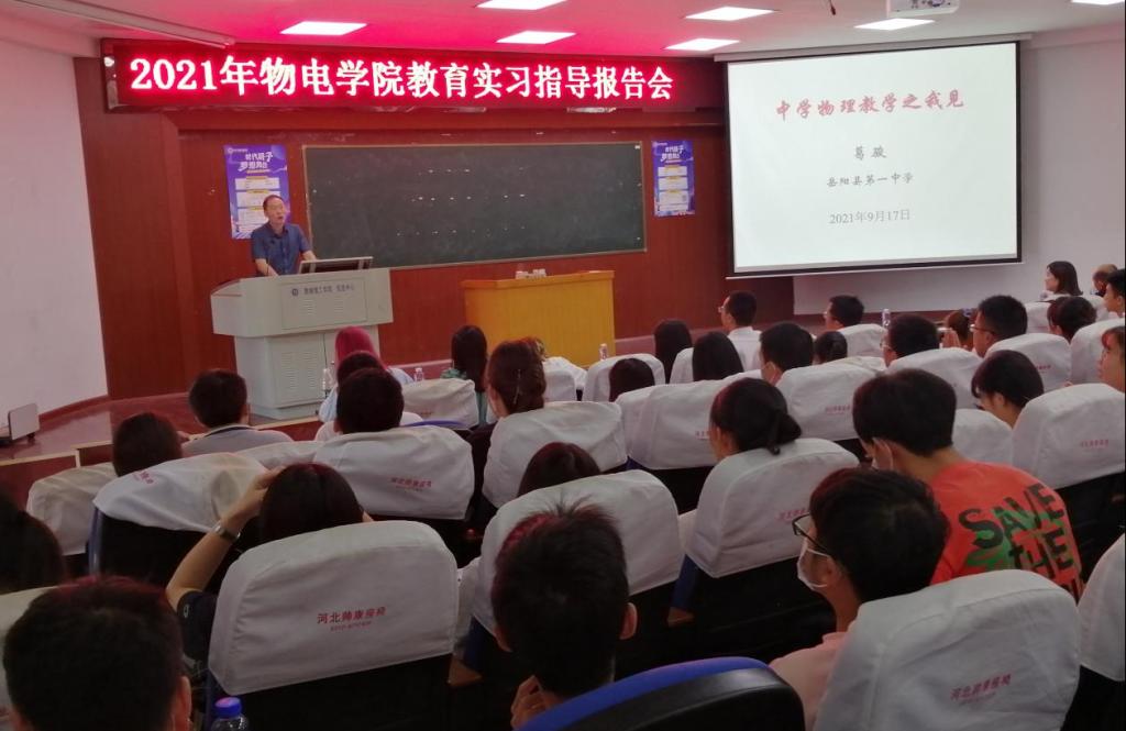 2021年9月17日上午,物理与电子科学学院在物电楼学术报告厅隆重举行教育实习指导报告会,副院长魏勇主持,副院长邹志军、李照宇、陈灏、李奇云等教师及各年级物理专业师范生200多人参加。来自实习基地学校的三位资深中学物理教师,针对中学物理教育教学、班级管理等方面,对我们的学生进行了悉心的教育和指导。