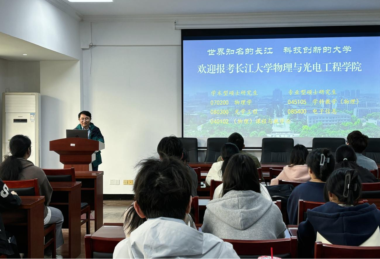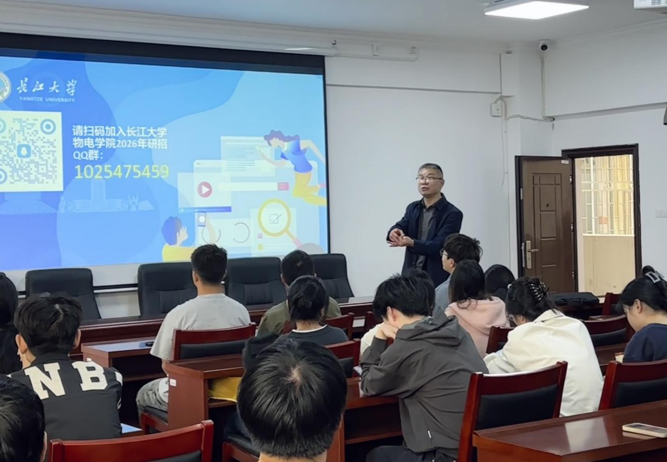 4月7日下午,长江大学物理与光电工程学院在我院开展研究生招生宣讲会。长江大学物电学院光电系主任黄海、教授程书博、代尘杰主讲,我院2022级相关专业学生参加。